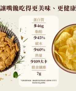 想食松露薯片但怕油膩? 採用慢火烘烤 (Slow-Baked) 取代油炸。與市售洋芋片相比,脂肪大幅減少 45%,碳水化合物減少 60%,熱量更少了 109 大卡。手指乾淨清爽,只有高級的香氣殘留。