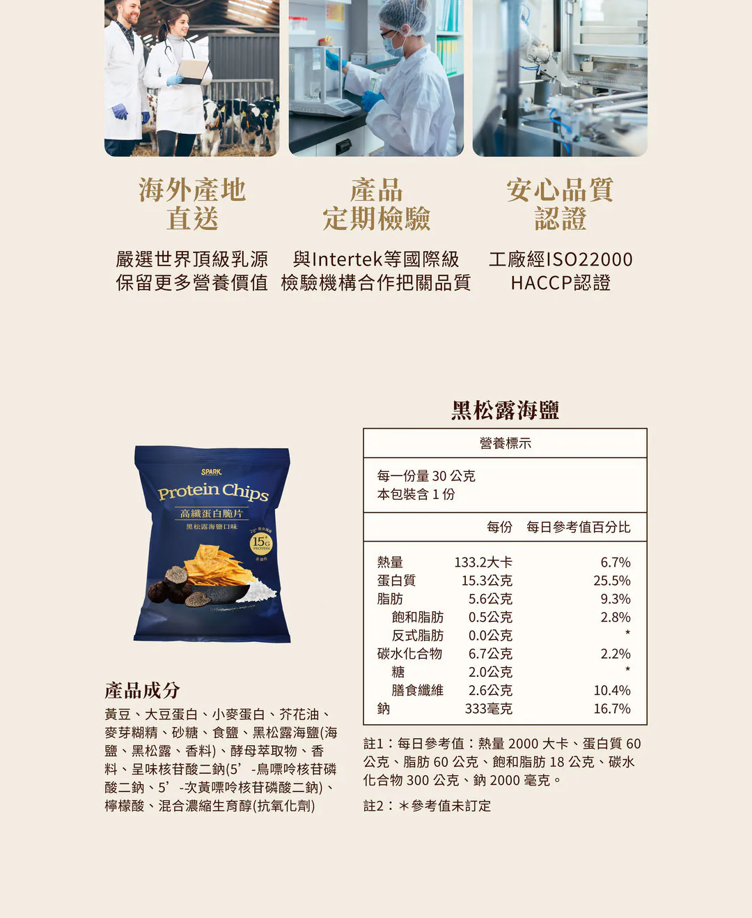 這是 Spark Chips 系列中蛋白質含量最高 (15.3g) 的皇牌口味! 比一般洋芋片多出 46g 蛋白質 (每100g計算)。使用優質大豆蛋白與小麥蛋白,讓你在享受奢華美味的同時,默默地為身體補充滿滿的修復原料。