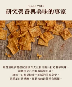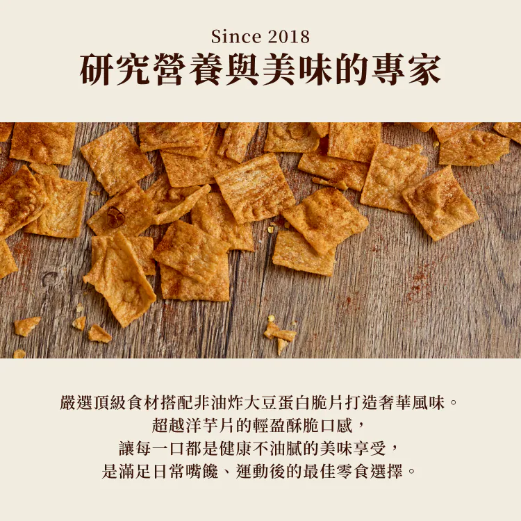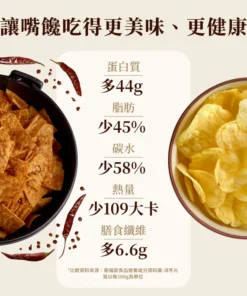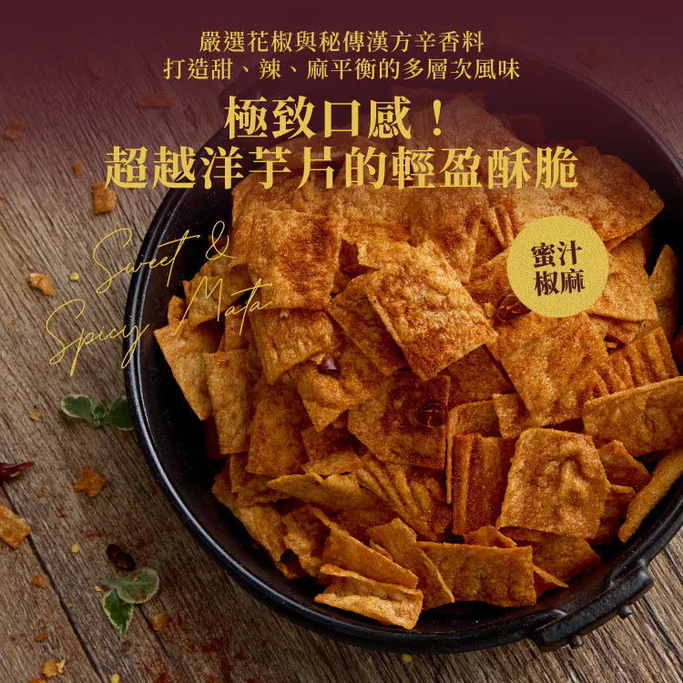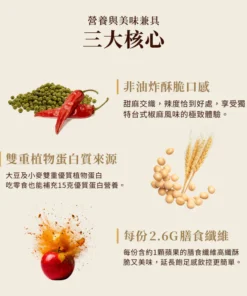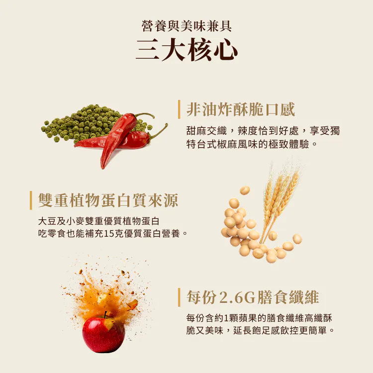 嚴選花椒與秘傳漢方辛香料,融合蜜汁甜香,打造出甜、辣、麻完美平衡的層次感。採用非油炸 (Slow-Baked) 工藝,呈現超越洋芋片的輕盈酥脆,卻減少了 45% 脂肪與 109 大卡熱量。每包提供 14.8g 優質植物蛋白,是深夜煲劇、朋友聚會時最「惹味」的健康下酒菜。