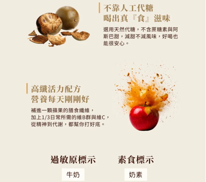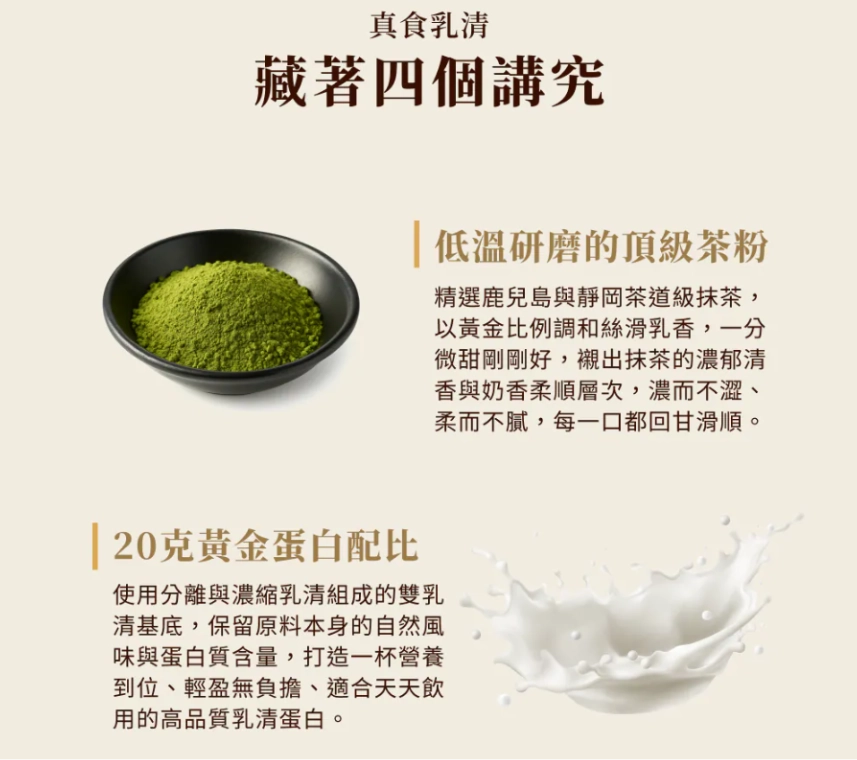 「這一杯,是對抹茶控最起碼的尊重。」 嚴選鹿兒島與靜岡兩大日本名產地的茶道級抹茶,以黃金比例調和出濃郁而不苦澀的深邃茶韻。堅持一分甜設定,僅用天然代糖提味,完美保留了抹茶的甘醇尾韻。每包提供 20.3g 優質蛋白,熱量僅 112 卡。這是早晨醒腦、午後回魂的「零罪惡」抹茶盛宴。