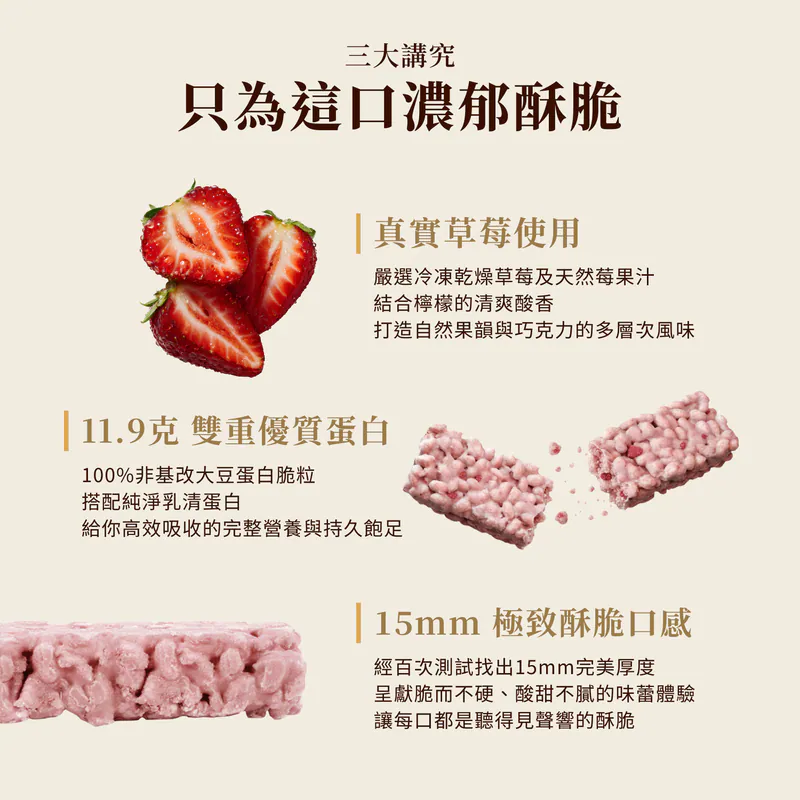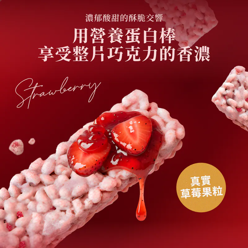 「市面上 90% 嘅草莓朱古力都係死甜、假甜、藥水甜。但呢一支?嗯… 過關。食落口係天然草莓味,酸酸甜甜。竟然仲有成 11g 蛋白質?算你有心,我批準上架。」