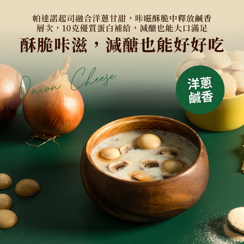 鹹味零食最講究層次。我們將香甜多汁的白洋蔥乾燥後細磨成碎粒,保留了天然的甘甜。再搭配義大利著名的 [這裡請插入外部連結:連結到維基百科的「帕達諾起司」頁面] 帕達諾起司 (Grana Padano),其獨特的濃醇奶香與鹹味,將洋蔥的甜味完美提鮮。每一口都是鹹、甜、香的奢華三重奏。