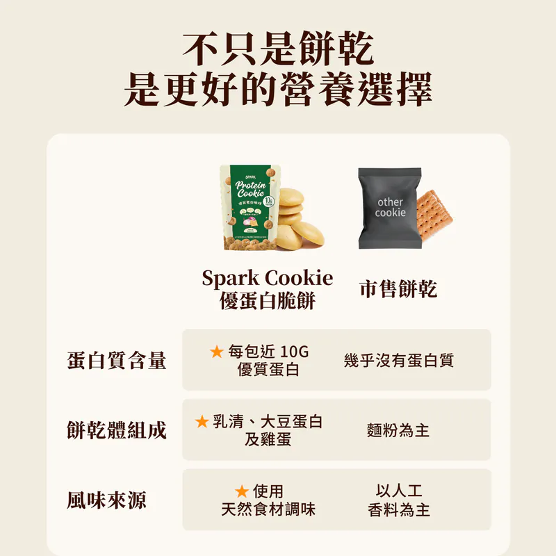 小小一包,營養驚人。每包 Spark Protein Cookie 洋蔥起司 含有 10g 蛋白質。混合了乳清、大豆、雞蛋三種不同來源的蛋白質,利用它們不同的吸收速度,為身體提供更持久、穩定的氨基酸供應。