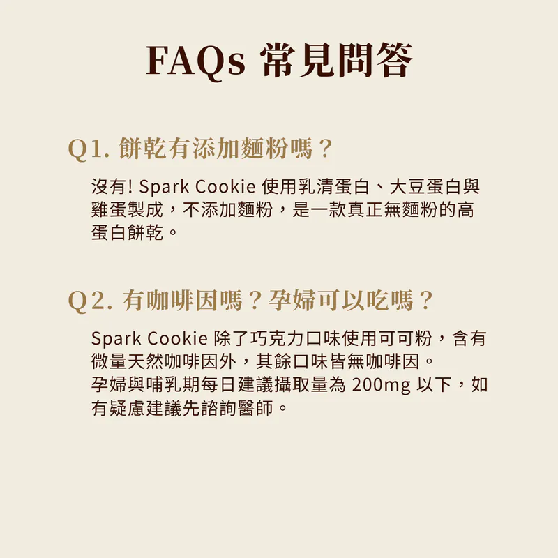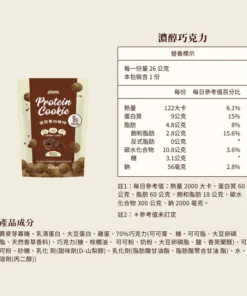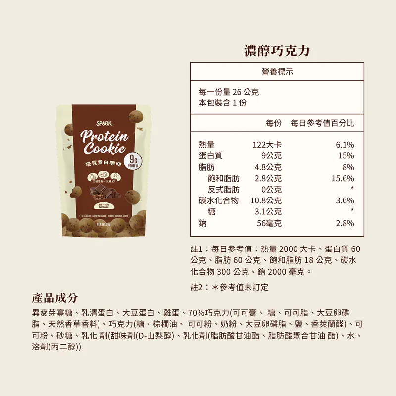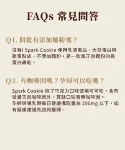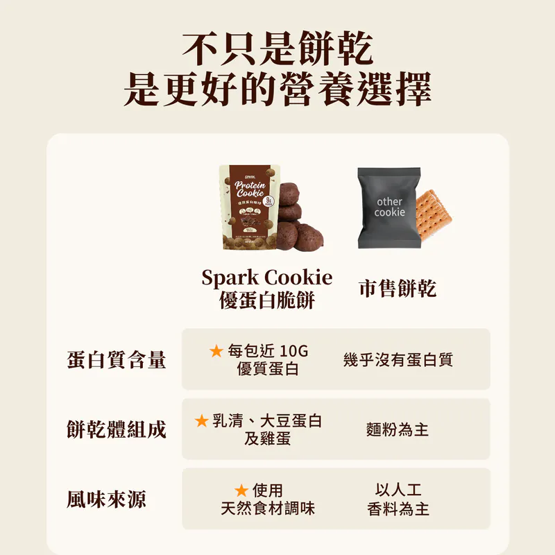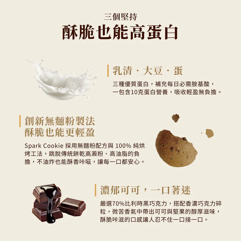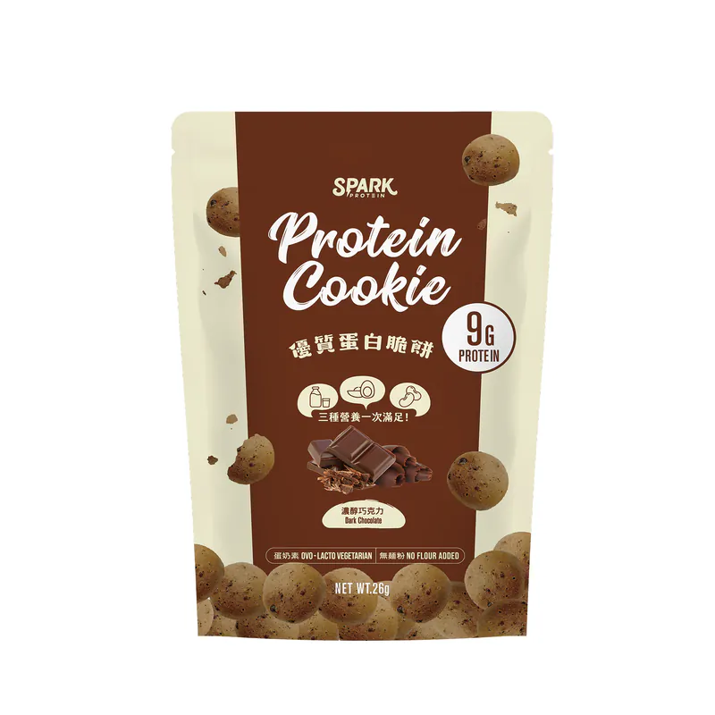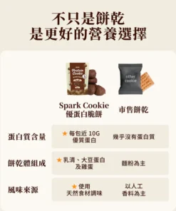 「這不是罪惡的曲奇,這是 9g 蛋白質的美味救贖。」 Spark Protein Cookie 濃醇巧克力嚴選70% 比利時黑巧克力,融合深黑巧克力碎粒,帶來濃郁的可可與堅果香氣。堅持無麵粉製程,改用AA級履歷蛋三重優質蛋白,打造出輕盈酥脆的口感。每包提供 9g 優質蛋白,是下午茶想吃甜點,但又不想破壞飲食計畫的完美選擇。