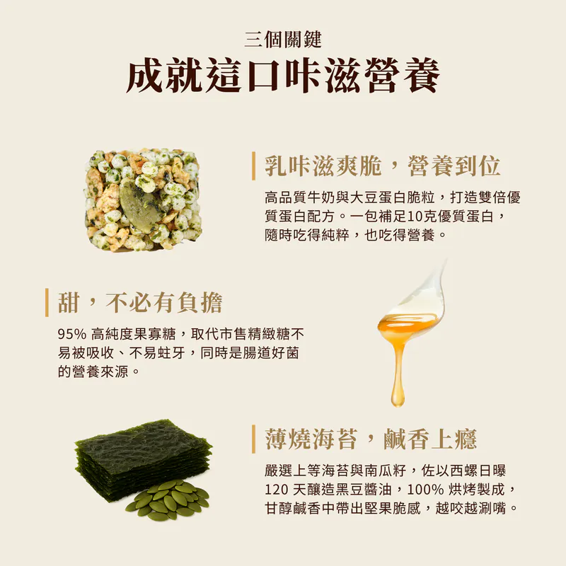 | 主要成分 | 大豆蛋白、牛奶蛋白、黑豆醬油、海苔粉、南瓜籽、果寡糖 |