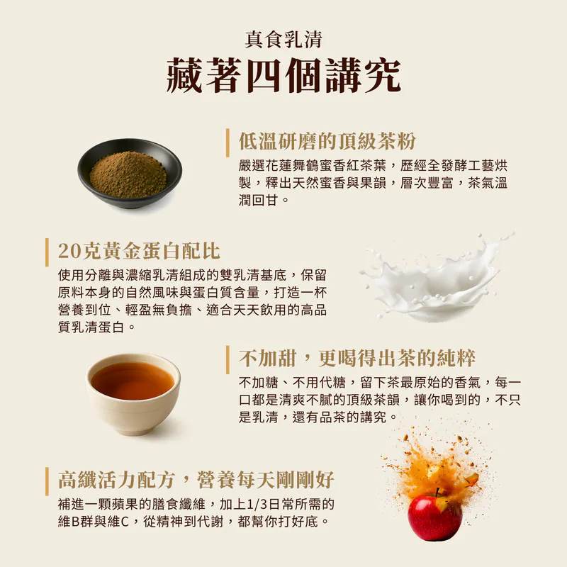 這是一杯機能強大的奶茶。每包提供 20g 雙重優質蛋白(分離+濃縮乳清),並含有高達 5381mg (約 5.3g) BCAA。無論是晨間喚醒身體,還是運動後解渴修復,它都能提供最純粹的能量。